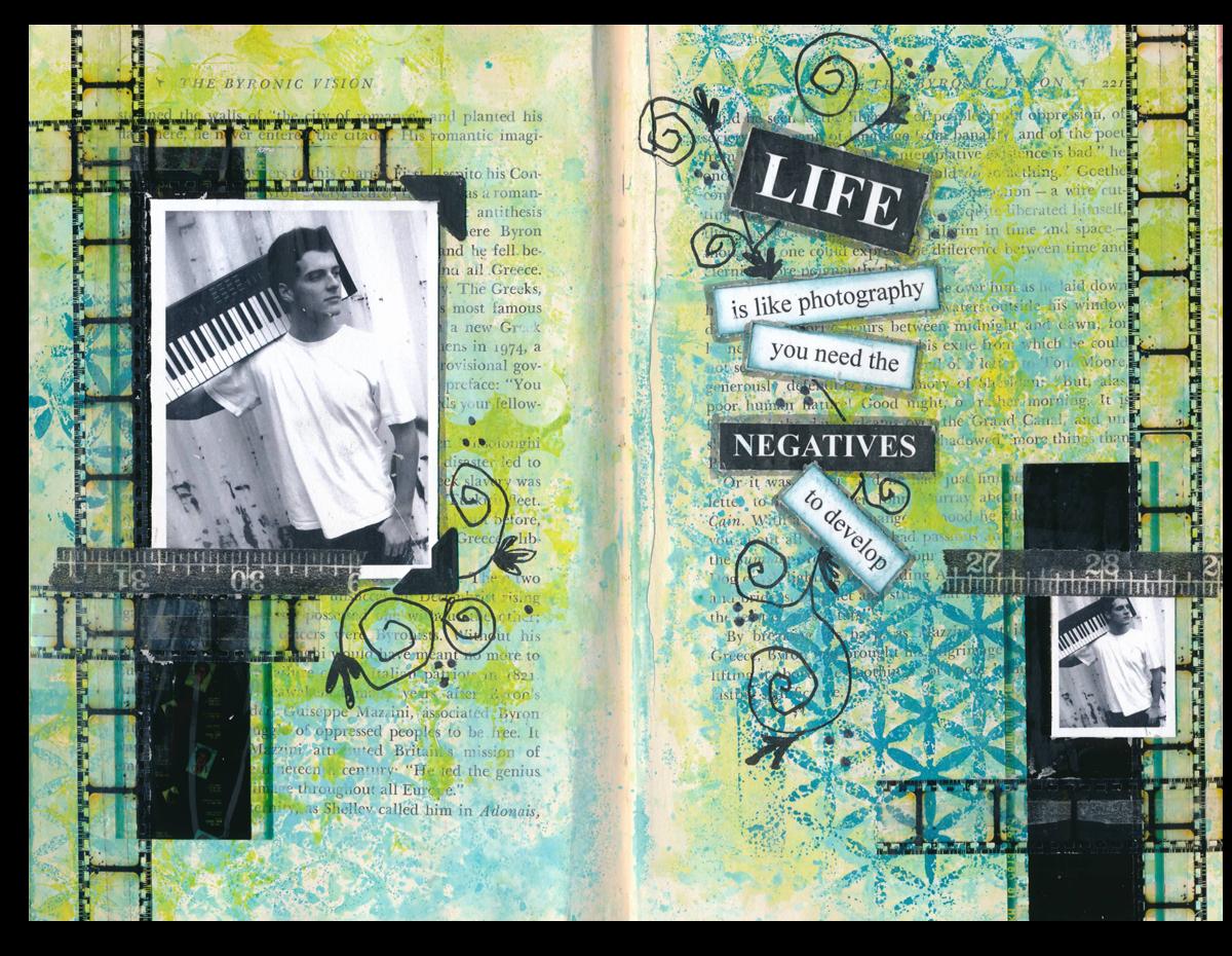 Because the background colours were so vibrant, I didn’t want to add colour to the top layers, so I used a black-and-white palette. I collaged two photos of my son Steven with two different sizes of filmstrip, added some washi tape and photo corners, and then doodled using a black pen. To make the words pop, I drew around them with a gray pen.