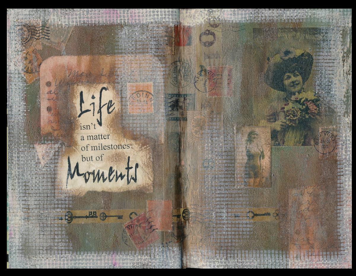 The background for this page was created using many layers of acrylic paint layered with 3D Stemple. I used collage to apply papers, images, and postage stamps — but I also used the acrylic paint method of photo transfer to get the Woman With Hat image onto the page. I rubber stamped many of the cancellation marks onto the postage stamps using black Archival ink. The gauzy white around the edges and in a few center areas was made using white acrylic paint applied through drywall mesh.