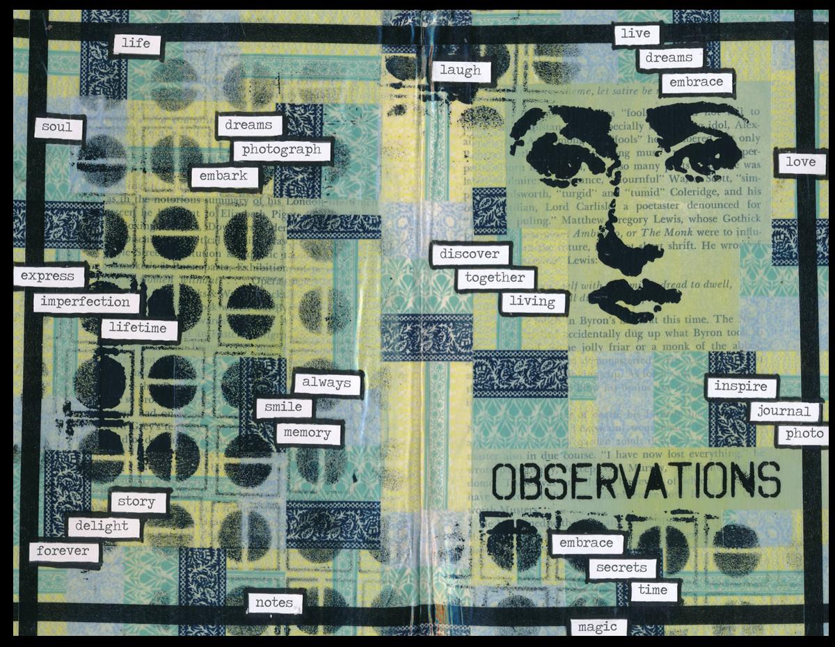 The background was made using acrylic paint applied with a baby wipe. I applied the black face and some black half-circle shapes onto the page using acrylic paint applied with a sponge through stencils. Next, came layers of washi tape adhered here and there and trimmed with a craft knife to create crisp edges where needed. The black border is also made with washi tape. Lastly, I adhered word stickers and edged around them with a black pen. The word “Observations” is a rub-on.