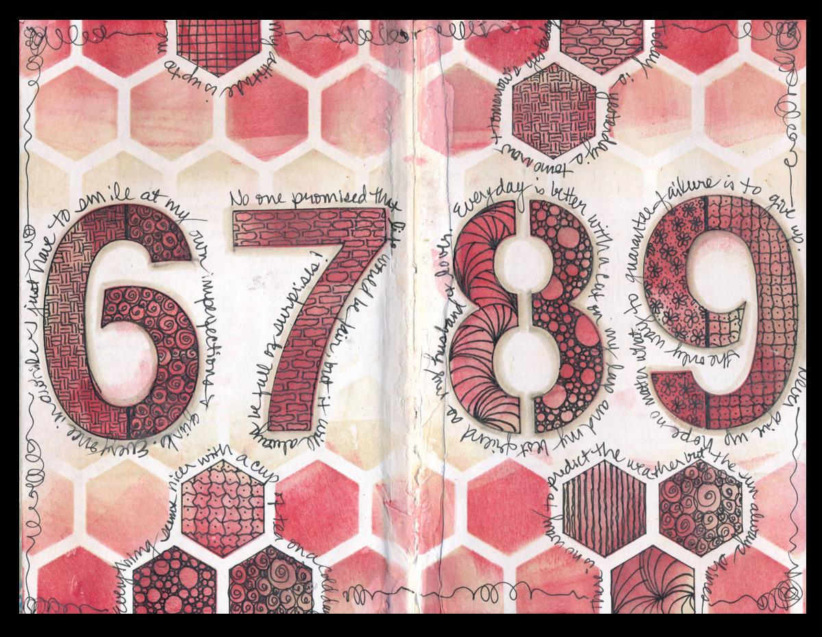 The background was painted white with acrylic paint applied with a baby wipe. Next, I applied Distress inks through hexagonal and numbered stencils with a blending tool. I doodled inside some of the shapes, and journaled around others. Lastly, I scribbled a border around the edge of the page with a black pen. To add a bit more dimension, I shaded around the number shapes using a light tan coloured Pitt marker with a brush tip.