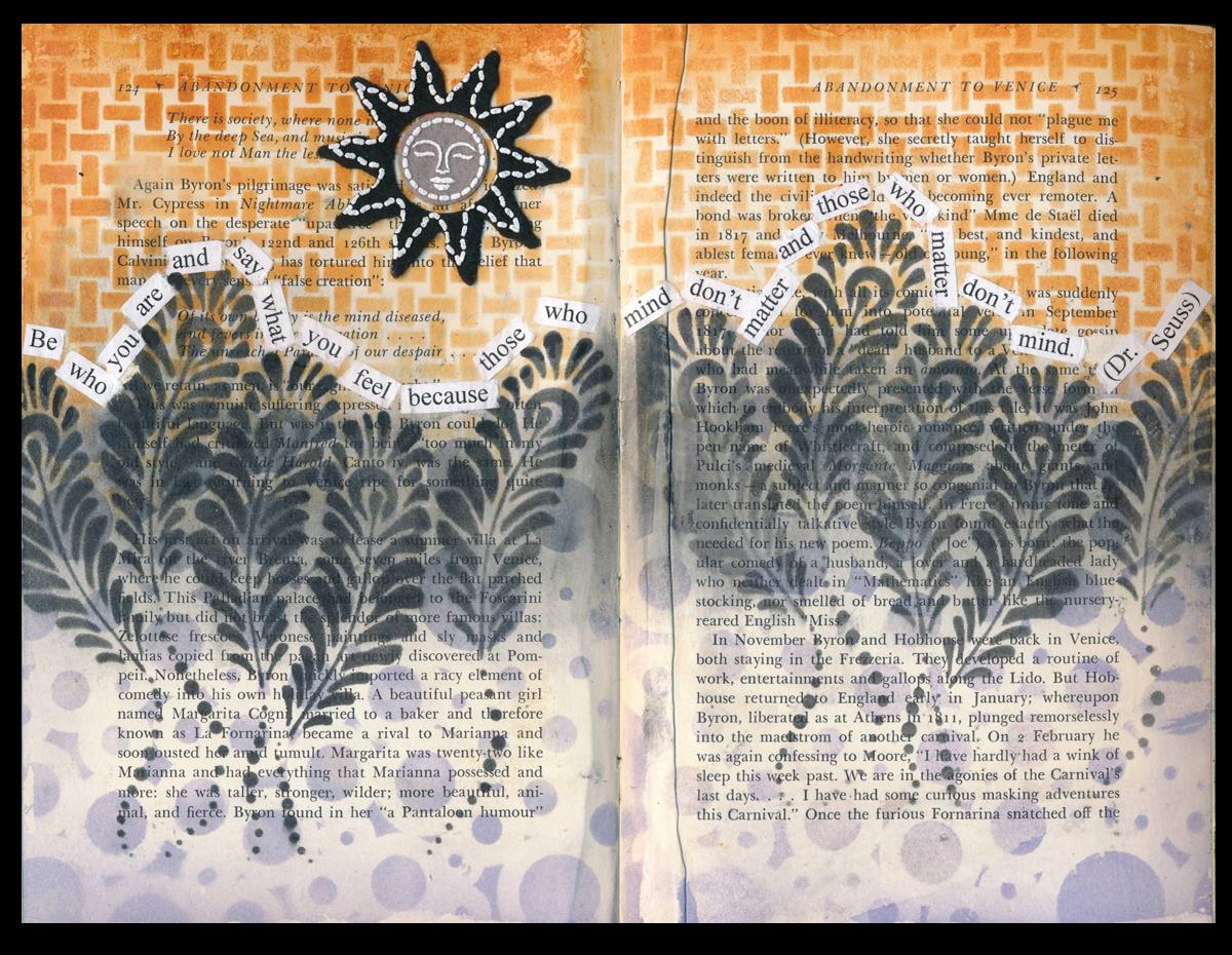 I love this quote and absolutely HAD to find a way to include it in my art journal. I made this background using Distress Ink applied with blending tools through stencils. I used warm colours (oranges) on the top, and cool colours (blues) on the bottom, and separated the two with a feather pattern stenciled in blank ink. Using the blending tool and a little more ink, I softly blended a little ink around the edges of the page.