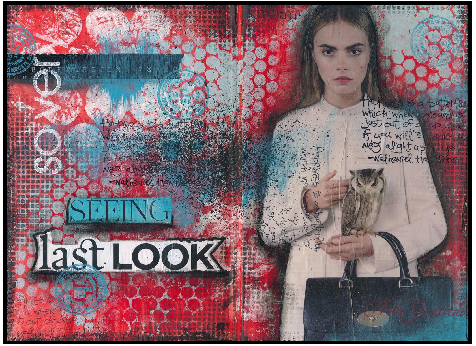 The lady holding an owl (as well as the words “seeing” and “last look”) were cut from magazines, collaged onto the page, and then outlined using both black and gray pens blended with my finger. I added a little washi tape to the upper left corner, and some rubberstamping with white and red paint and black ink. I sponged and rubberstamped some turquoise blue paint onto the page, and also wiped bits of blue onto the page directly from a sponge wedge. The last thing I did was splatter some watered-down black paint onto the center of the page with a toothbrush.