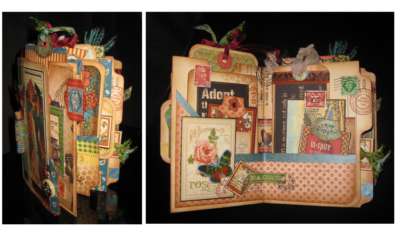 In the first session (June 9th), we’ll create the Mini Album itself, and (time permitting) begin some of the interactive contents.  In the second session (June 16th) we’ll create the two mini booklets, pockets, flaps, carriers, tags, and several different kinds of envelopes (some from scratch and some using the Envelope Punch from We R Memory Keepers).  I will provide the tools needed to make a wide range of pull indicators for all of the interactive pieces, and a huge assortment of fibers (ribbons, yarns, lace, fabric scraps, and other trims) for you to choose from.
