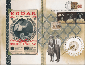 Here is one of the pages: Kodak for Christmas. I began this page with a strip of black-and-white polka dotted washi tape down the left side of the page, followed by a found image of a vintage camera ad. On the right, I pieced together two Tim Holtz lattice dies, and rubbed it with a gold Faber Castell Gelato to soften the black. I layered on more found images (including the Tim Holtz die cut of the man and woman). I rubbed some Distress Ink onto the page using a blending tool, and added vintage postage stamps (one of them, cancelled with a rubber stamp and black Archival ink), a doily, a clock face image, and a metal clock arm. Gold photo corners on top of the Christmas ad completed the page.
