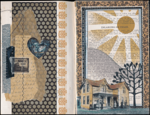I used a craft knife and metal ruler, along with a pair of precision scissors, to cut away the parts of the page that I didn’t want while keeping the border around each page, and the featured image that I wanted on each (house, tree, and hill). I purposely spaced the border around each page to be of varying widths, starting with a narrow border, and progressively getting thicker. That way, the borders themselves “nest” when you look at all 4 pages together — and you see the various layers more clearly.