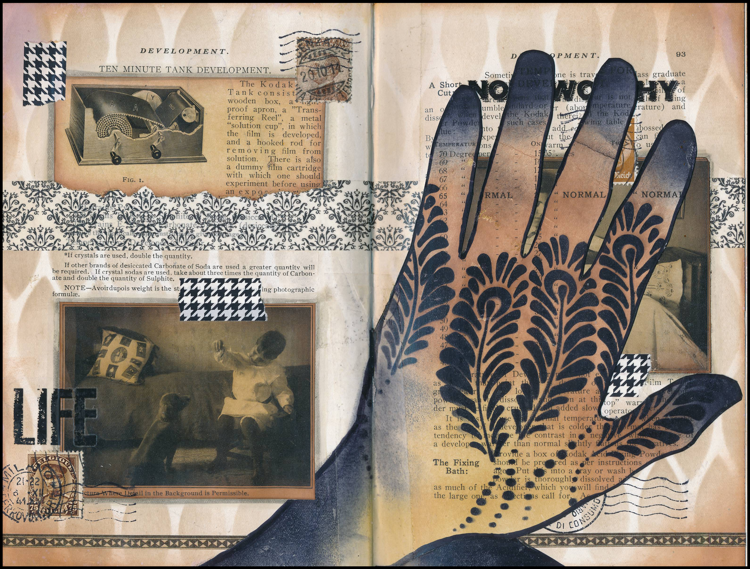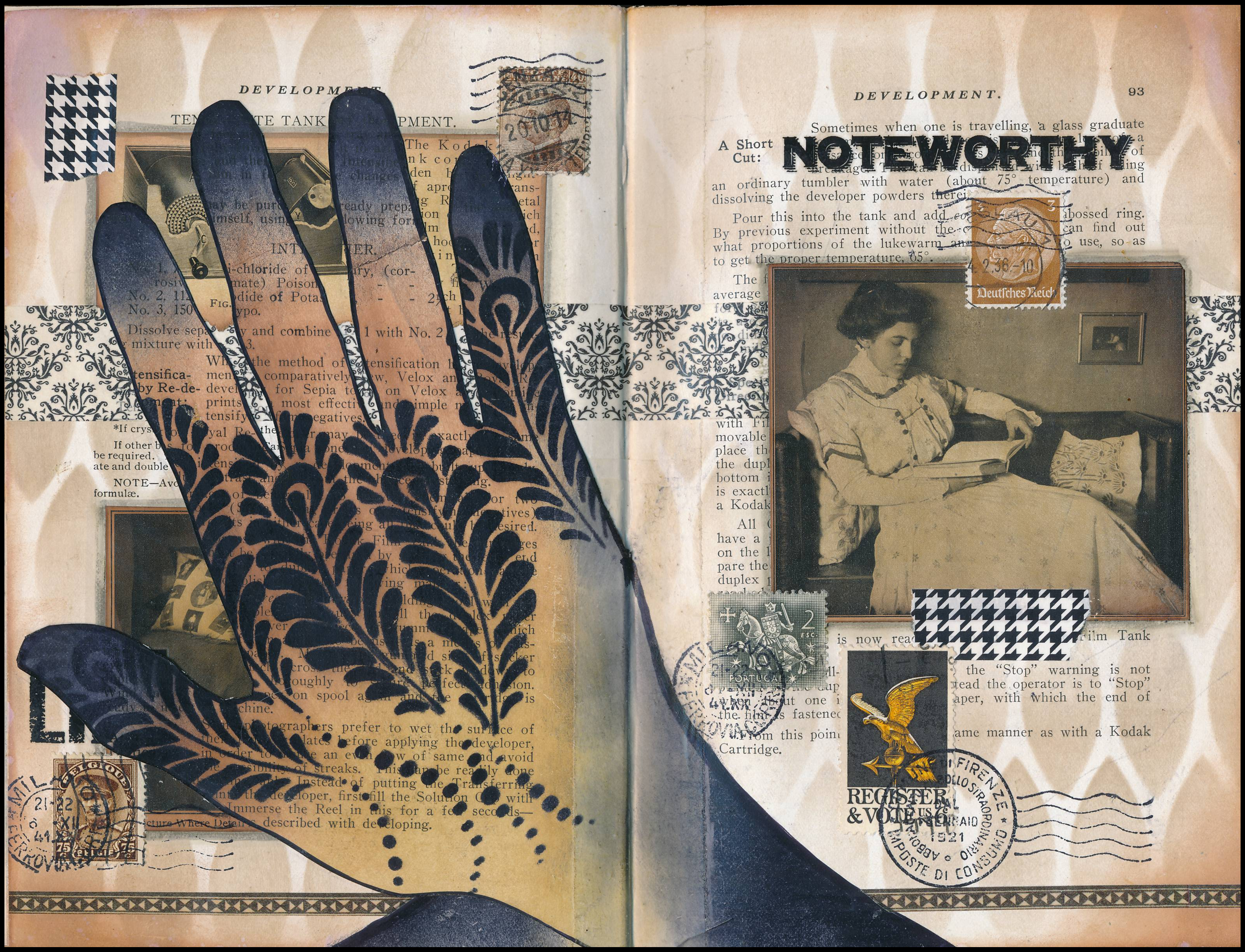 For the rest of the page, I applied a faint pattern to the background using stencils, blending tools and Distress ink, and added images cut from other pages, washi tape, postage stamps, and rubber stamps to add additional features. The words “Life” and “Noteworthy” are rubons.