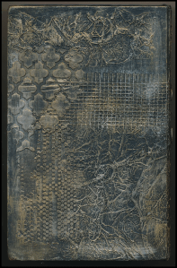 I wanted this cover to be very textural. I used modeling paste applied through several different stencils to create some of the texture, drywall tape (which provided an instant mesh grid texture), and crumpled tissue paper applied with Mod Podge. I let these all dry, and then painted everything (except the title) with black acrylic paint. I used a dry-brush technique to apply various colours of metallic silver and gold paint, which really brought the texture to life.