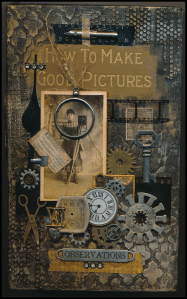 For this particular art journal, I wanted to preserve the title of the book (“How to Make Good Pictures”) since the subject matter of the book (photography) became the theme of this particular art journal. So I saved the title and added treatments and objects around it.